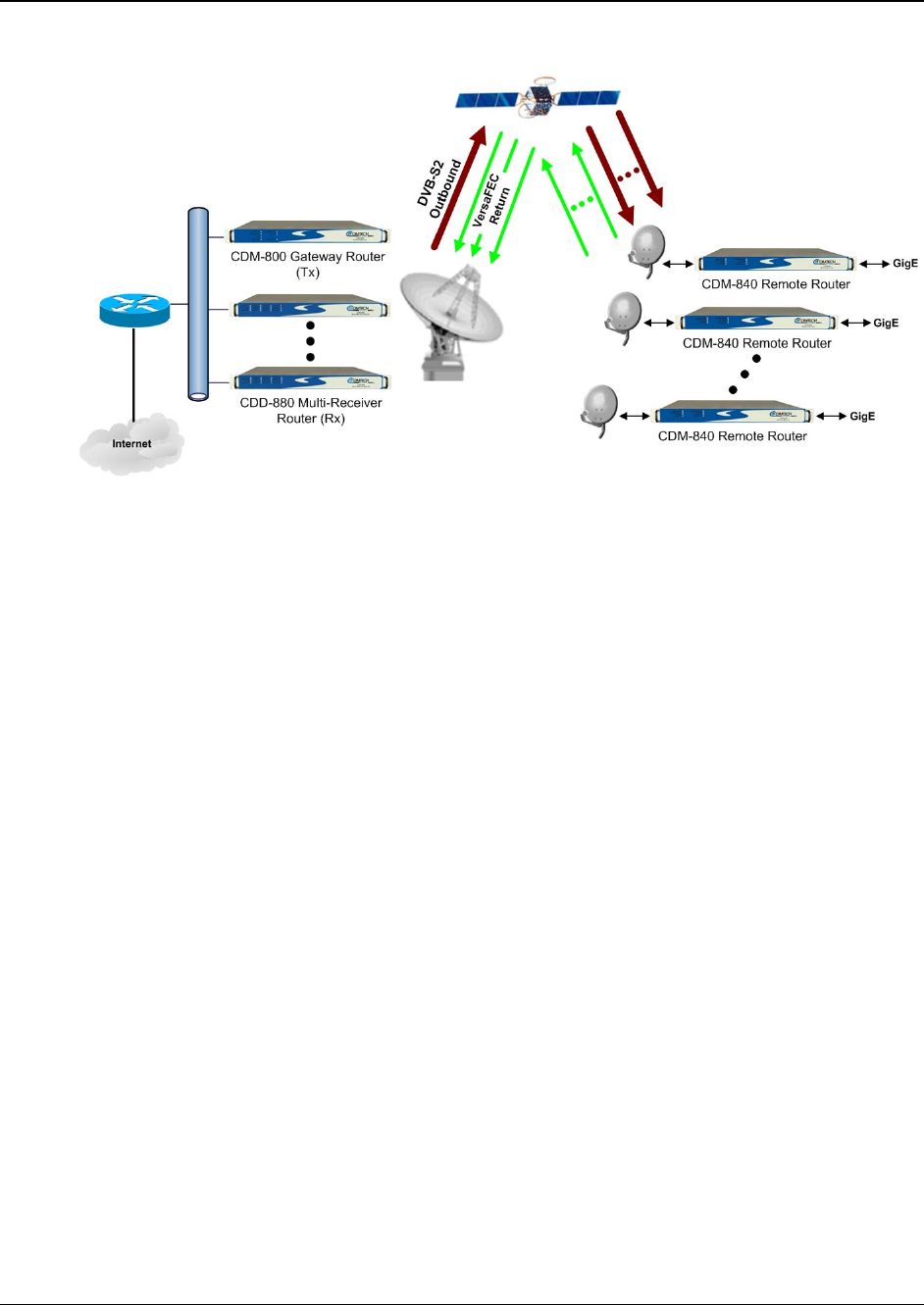 illustrates the CDD-880 Multi Receiver Router as deployed in a typical satellite-based