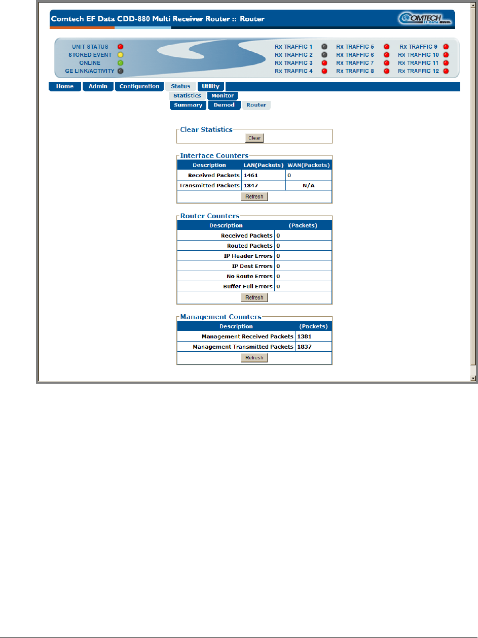 The ‘Status | Statistics | Router’ page (Figure 5-16) is used to view cu