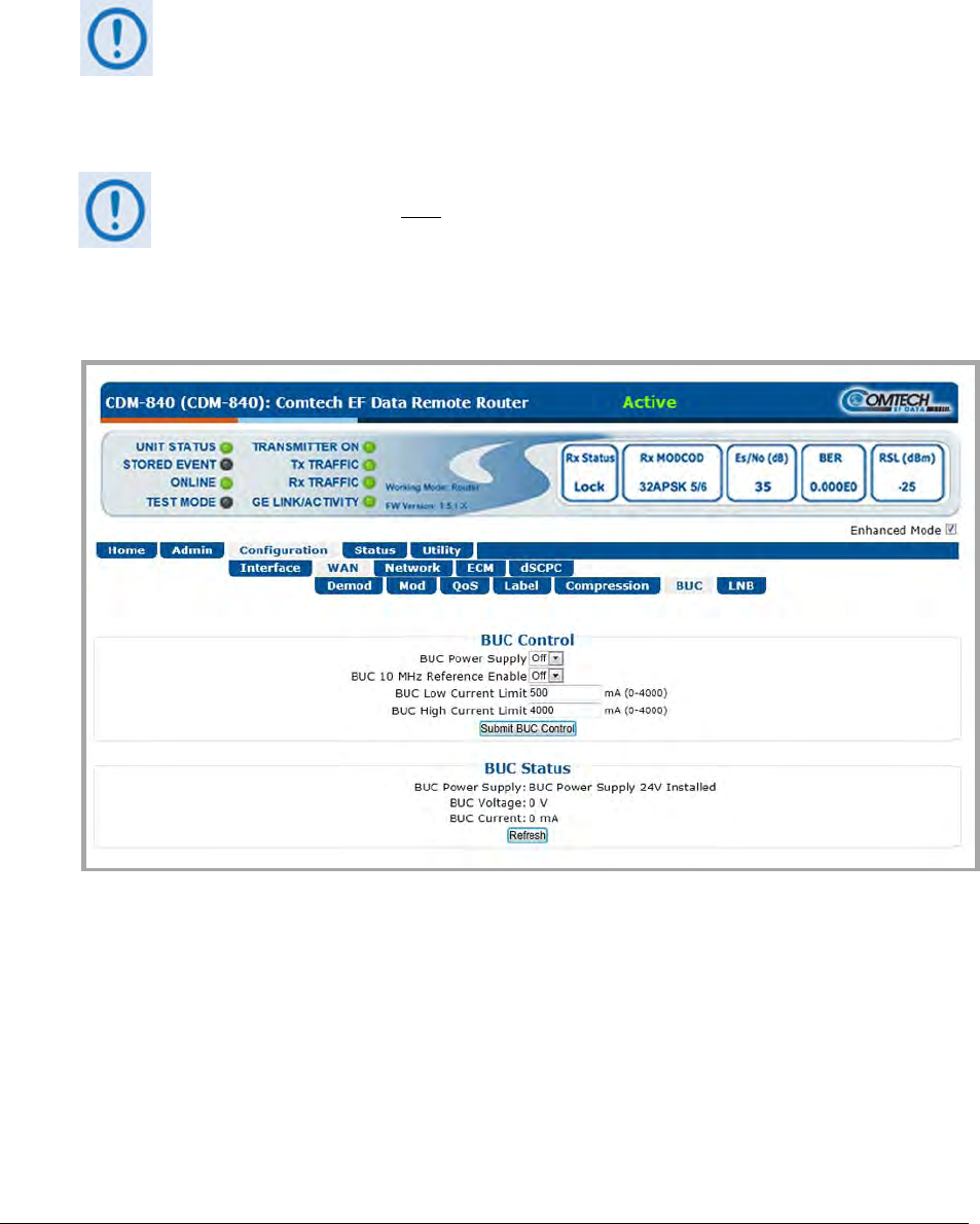 Use this page to configure Block Upconverter parameters, and to display the BUC status for