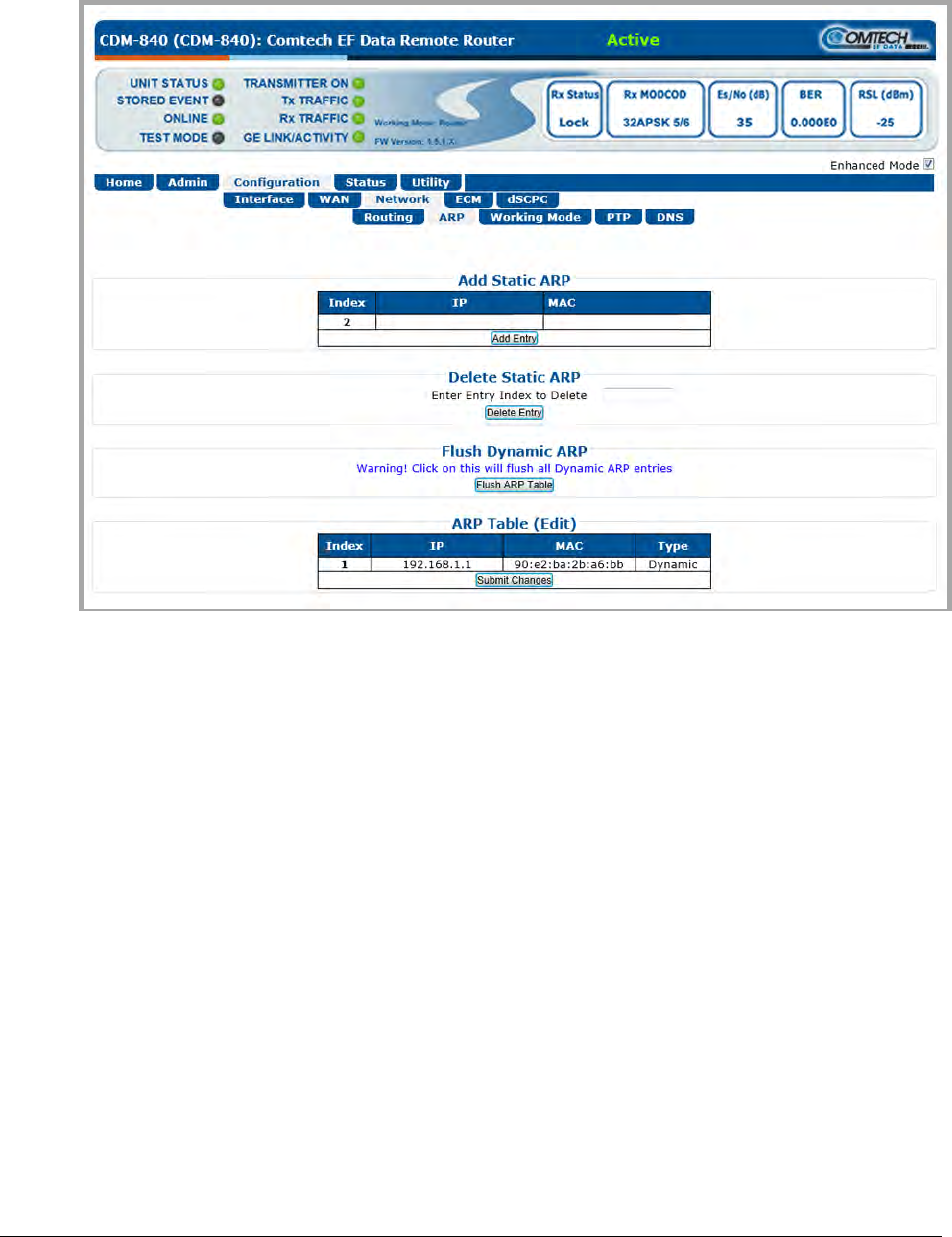 Use this page to configure CDM-840 ARP (Address Resolution Protocol) parameters.