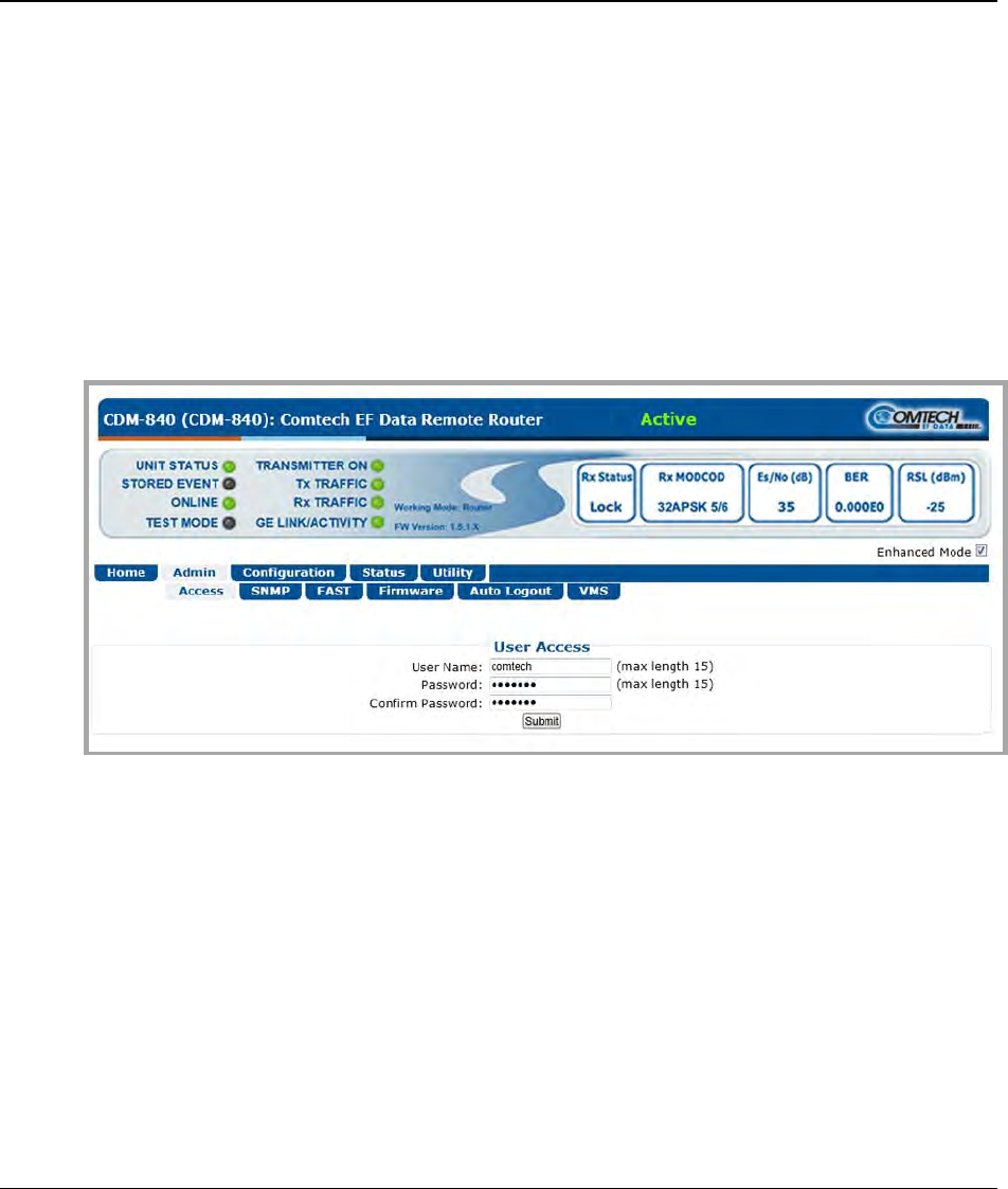 The Administrator must use this page to manage the CDM-840 Web Server Interface user access