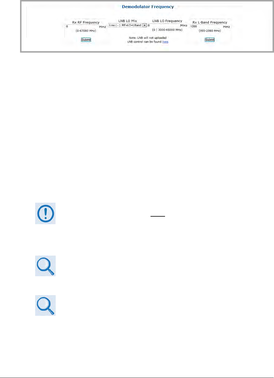 Enter the Rx RF Frequency in MHz, and then click [Submit]. Upon submission, if the LNB LO